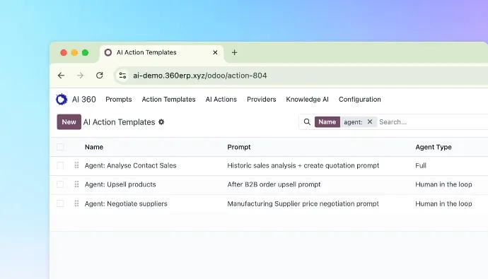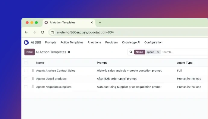 Odoo has AI, and that’s fine. But it’s generic and only for Odoo v19. 360 AI understands you because we already know you. We combine consultancy with smart and ultra-simple tools. That means we don’t just deliver tech; we actually support you. As part of the 360 AI Community, you get features that are genuinely useful and help you move forward, without feeling like you’re stuck in a trial phase. We deliver AI tailored to you (yes, this time ‘custom’ isn’t a dirty word). And to top it off, 360 AI has support for Odoo v16, v17, v18 and v19. We build solutions that do exactly what you need, and we share them as community code. Need us to wrap it up for you, or are you ready to dive in?